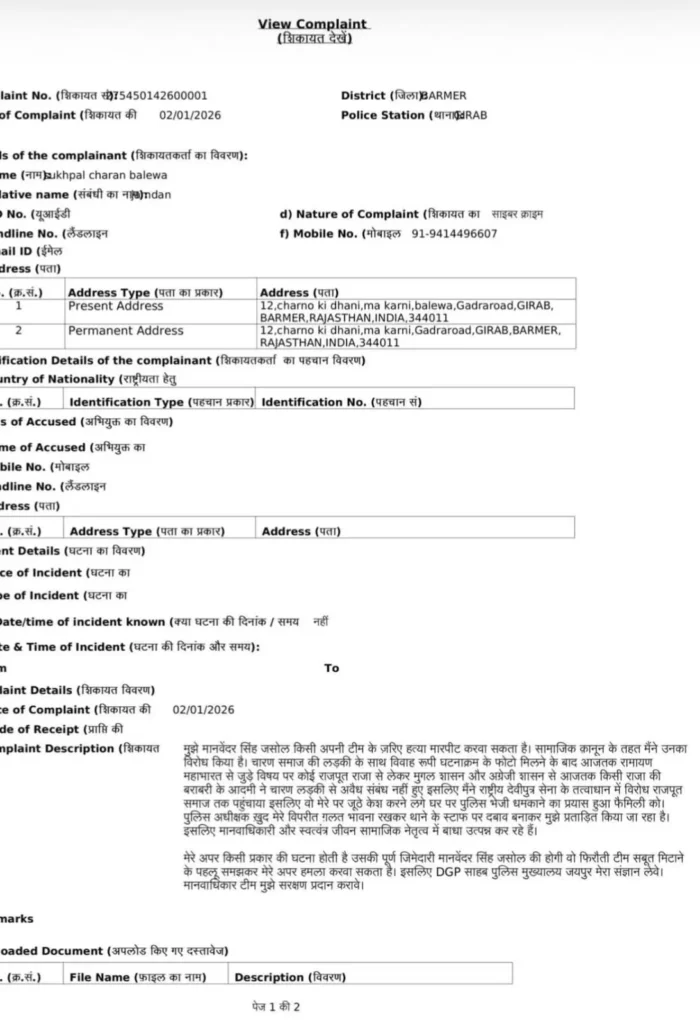 प्राप्त जानकारी के अनुसार शिकायतकर्ता सुखपाल चारण (निवासी: चारणों की ढाणी, गडरारोड, गिराब, बाड़मेर) ने पुलिस थाने में लिखित शिकायत दर्ज करवाई है। शिकायत 2 जनवरी 2026 को दर्ज की गई। शिकायत में युवक ने आरोप लगाया है कि मानवेन्द्र सिंह जसोल की ओर से उसे जान से मारने या हमला करवाने का खतरा है।